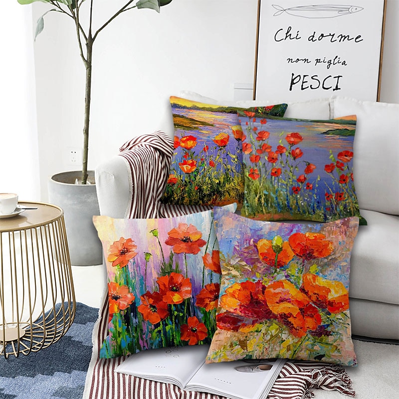 Set of 4 Artistic Flowers Square Decorative Throw Pillow Cases Sofa Cushion Covers  Home Sofa Decorative  Faux Linen Cushion Cover for Sofa Couch Bed Chair Red 17