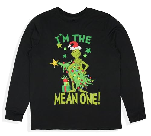 • FUN HOLIDAY PRINT - This two-piece set features a black long-sleeve top featuring the Grinch stealing a Christmas tree with the text "I'm The Mean One." The contrasting plush green pants feature an allover design of Stars and the Grinch wearing a Santa hat. Transform into the Grinch with this delightful lounge pajama set