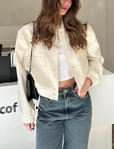 Womens Cropped Baseball Jackets Casual Button Down Bomber Varsity Jacket Coats Outerwear with Pockets 1