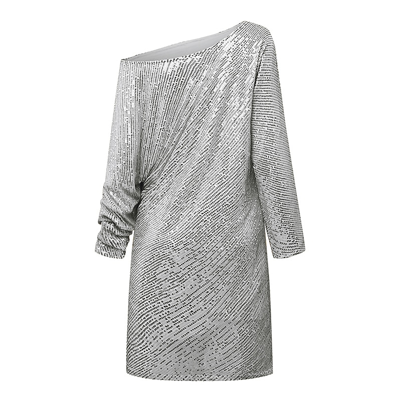 HOT ! Women's One-Shoulder Asymmetric Knit Dress Silver Sparkle Three-Quarter Sleeve Cocktail Party Above-Knee Elegant Winter Semi-Formal Clothing Apparel