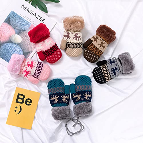 Kids Mittens Winter Warm Knitted Gloves Ski Gloves Mittens Multipack Elk Gloves On String with Fleece Xmas for Girl Boy 3-8 6