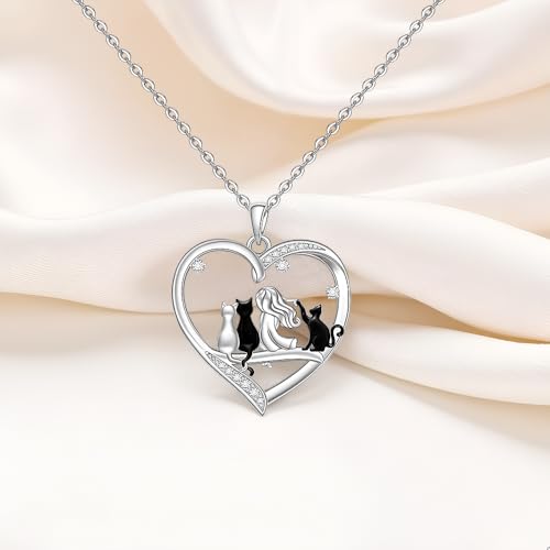 Black Cat Necklace for Women Sterling Silver Cat Necklaces Heart Jewelry Charm Elegant Pendant Gifts Adjustable 7