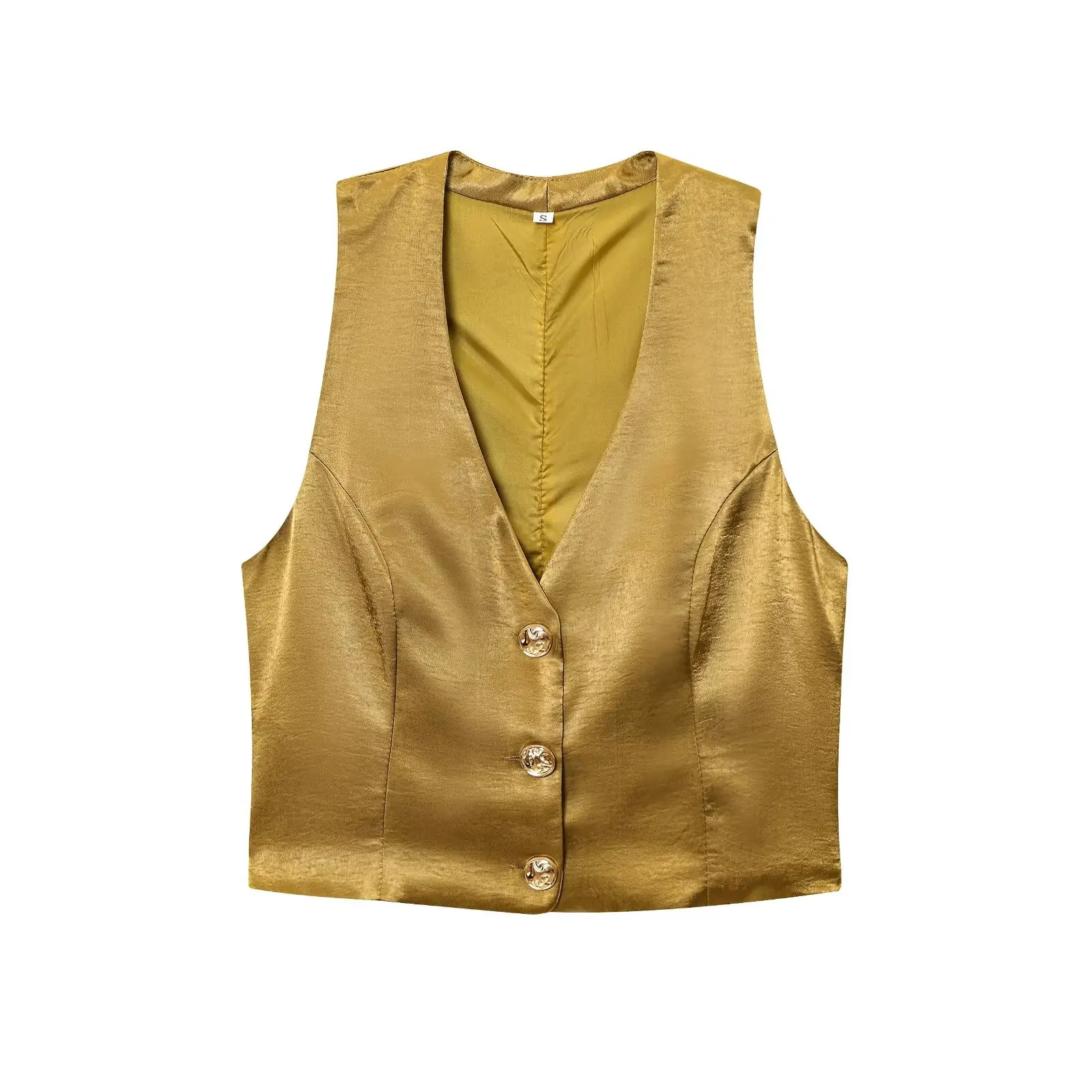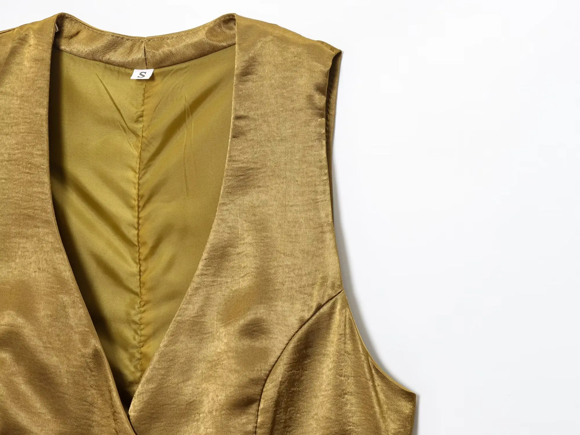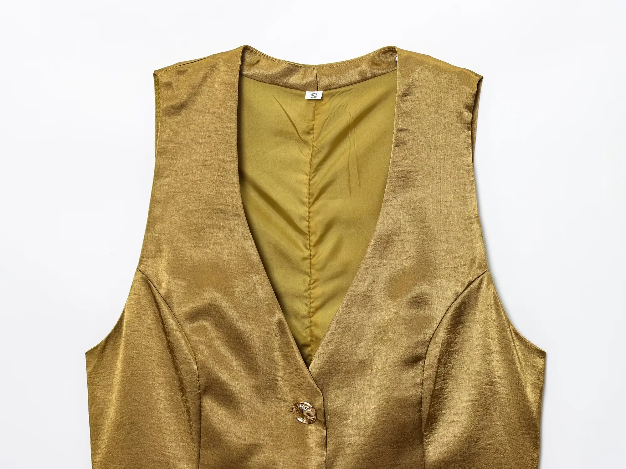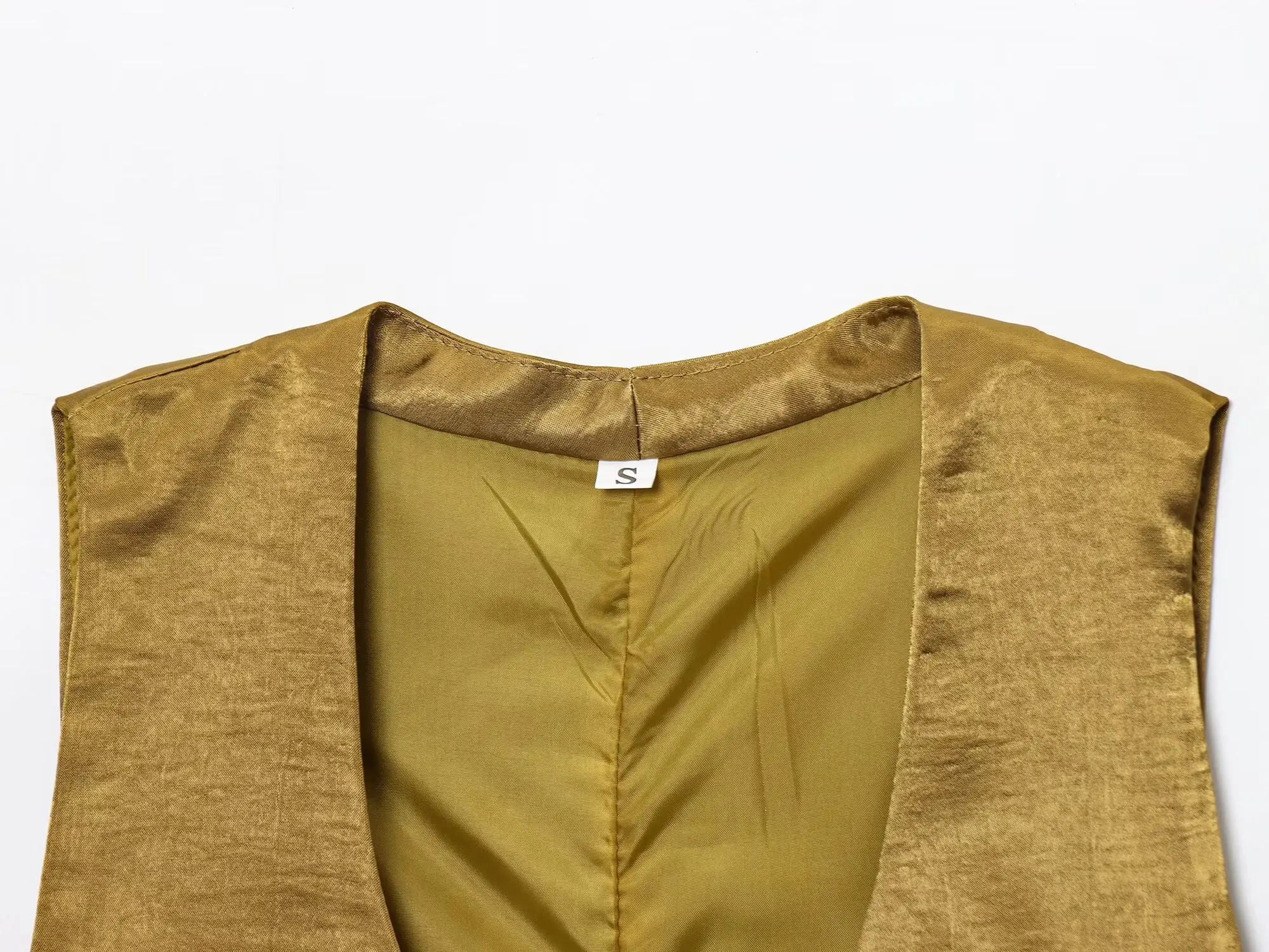 SPECIFICATIONSAge: Middle AgeBrand Name: TRAFZAClosure Type: Single BreastedCollar: V-NeckCraft of Weaving: TatDecoration: ButtonElasticity: Non StrechFabric Type: Man-made fiberFit Type: LooseGender: WomenHign-concerned Chemical: NoneMaterial: POLYESTERPant Length(cm): Ankle-Length PantsPattern Type: SolidSeason: SummerSleeve Length(cm): SleevelessSleeve Style: RegularStyle: Casualsize_info: {sizeInfoList:[{length:{cm:82,inch:32.28},size:XS,vid:872},{length:{cm:86,inch:33.86},size:S,vid:100014064},{length:{cm:90,inch:35.43},size:M,vid:361386},{length:{cm:94,inch:37.01},size:L,vid:361385}]}whether full opening: Yes