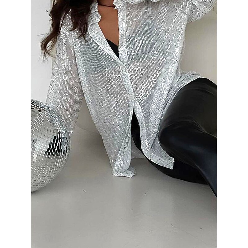 HOT ! Mardi Gras Women's Going Out Tops Summer Tops Plain Fashion Hot Modern Long Sleeve Shirt Collar Regular Tops Party Evening Wear Going out Party Outfits Sequins Buttons Silver Black Summer Spring Fall