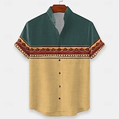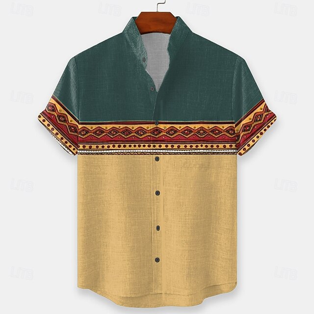 Men's Geometric Indian Ethnic Shirt Button Up Shirt Stand Collar Shirt Short Sleeve Vintage Retro Vacation Dailywear Beach Wear Summer Spring Mandarin Collar 3D Print Linen Like Shirt Yellow Blue 7