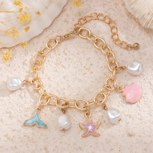 HOT ! Gold Shell Charm Bracelets for Women Pearl Seashell Bracelets Starfish Shell Mermaid tail Pendant Bracelets Beach Jewelry for Women
