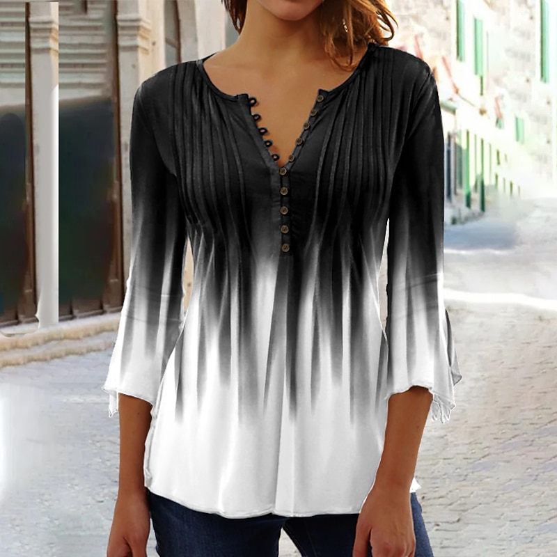 : This blouse features a trendy gradient color design that smoothly transitions from black at the shoulders to a vibrant turquoise at the hem, creating a striking visual effect. The V-neckline is adorned with a row of small buttons, adding sophistication to its casual style. Additionally, the slight flare at the cuffs and pleated front details contribute to its stylish and feminine appearance.