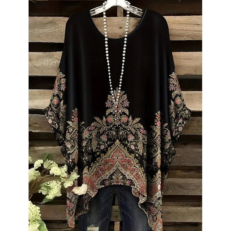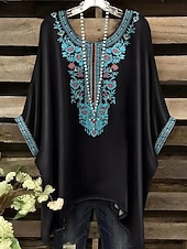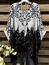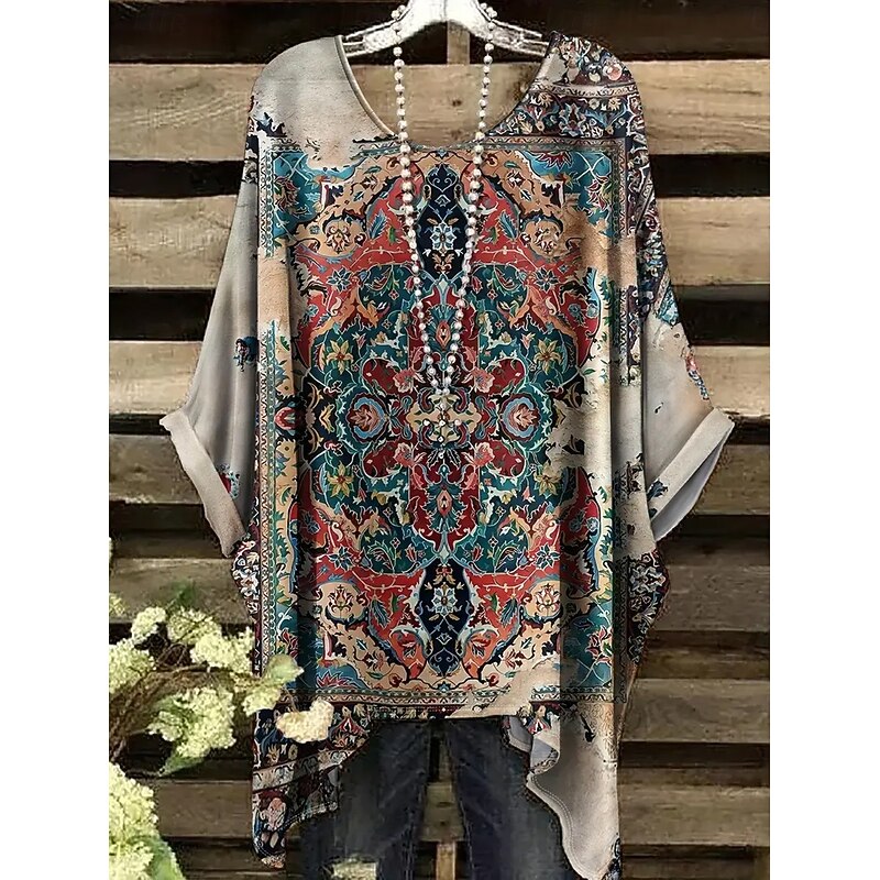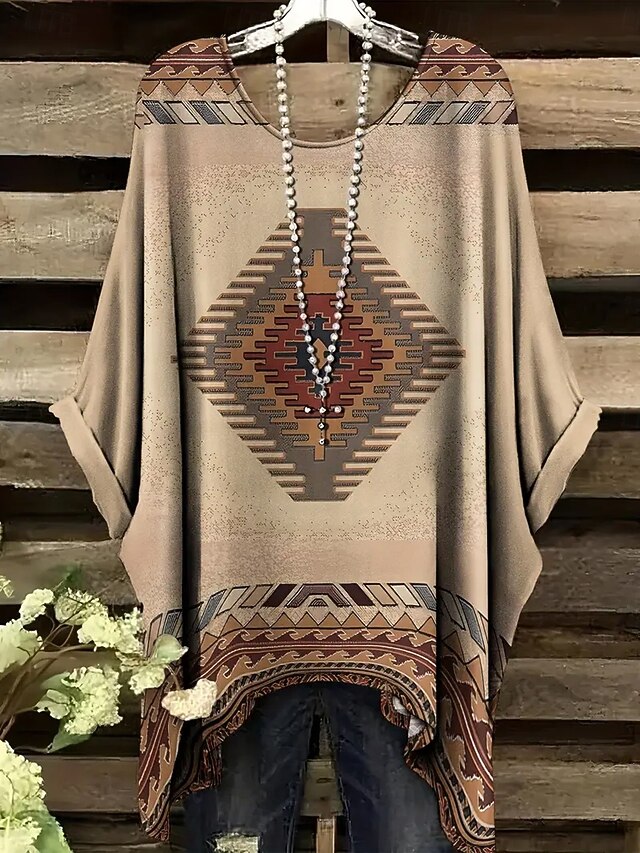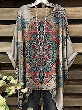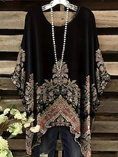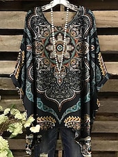 More information about Women's Blouse Graphic Geometric Vintage Daily Casual Half Sleeve Batwing Sleeve Crew Neck Regular Tops Daily Holiday Beach Wear Asymmetric Black White Blue Green Khaki Summer Spring