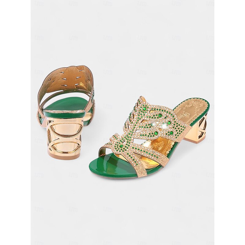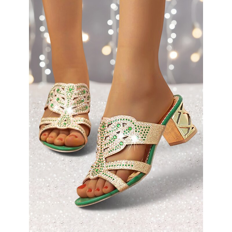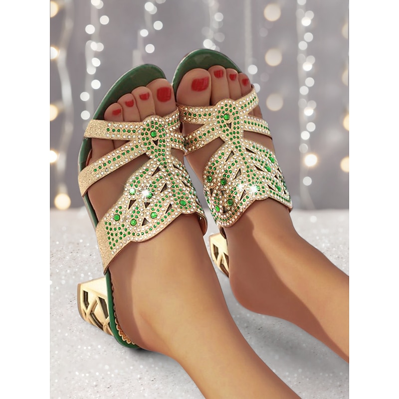 HOT ! Gold and Green Rhinestone Embellished Heeled Sandals - Women's Glamorous Evening Shoes