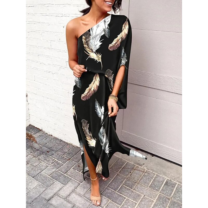 HOT ! Women's Maxi Dress Off The Shoulder Dress Vacation Casual Boho Outdoor Beach Loose Fit Graphic Leaf 3/4 Length Sleeve One Shoulder Black White Blue Khaki Summer