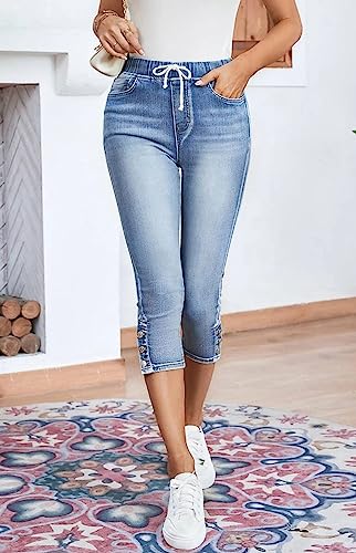 Conshvi Women's Drawstring Elastic Waist Slim Fit Pull On Capri Jeans Casual Stretch High Waisted Distressed Capris Pants 4