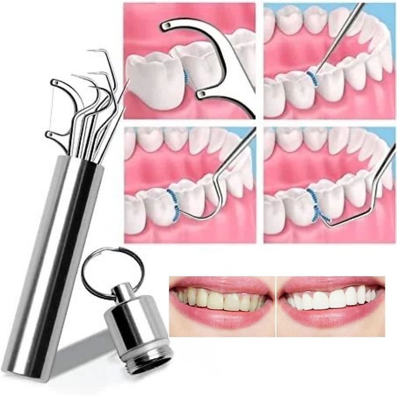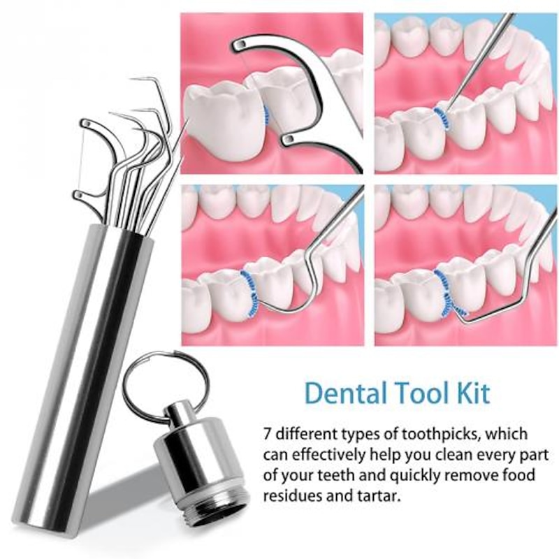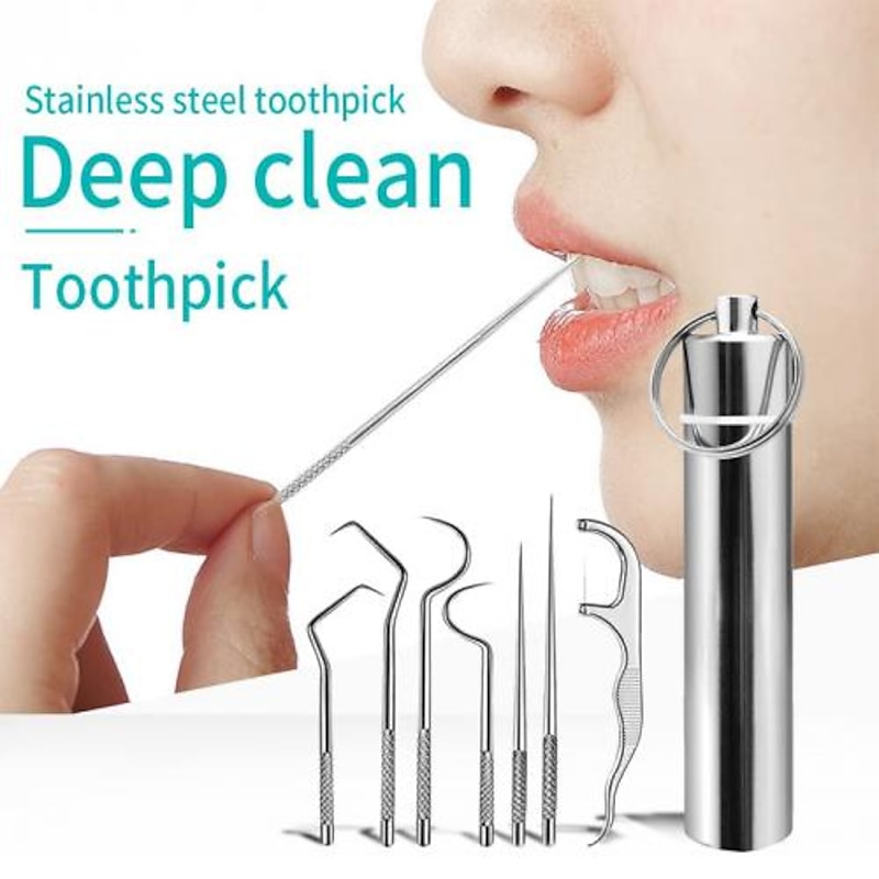 Highlights Product Selling Points: 1. Promotes dental health: If you're feeling sick, start paying attention to your dental health now and let this handy gadget help you with those issues. 2. Cleanest dental and freshest breath: Using this gadget every day will give you the cleanest dental and freshest breath time and time again, allowing you to show your healthy smile to the world. 3. Portable stainless steel toothpicks: Instead of cheap and weak dental scraping tools, this gadget provides high-quality toothpicks made of smooth stainless steel metal with ultimate strength. 4. Wide application: The stainless steel toothpick is versatile and can be used as fruit picks or to help you open the phone slot, making it a practical tool for camping, hiking, picnic, cycling, travel, and daily use. 5. High-quality material: The toothpicks are made of 304 stainless steel, ensuring durability and longevity.