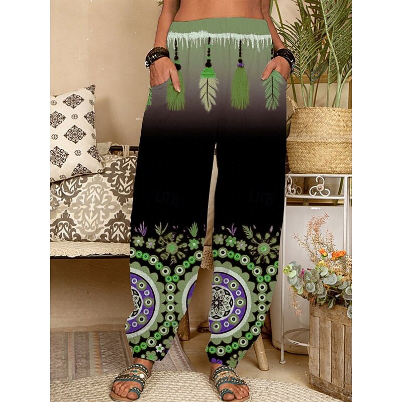 HOT ! Women's Chinos Pants Trousers Vintage Ethnic Style Long High Waist Graphic Feather Pocket Elastic Waist Printing Breathability Soft Micro-elastic Vacation Street Daily Wear Yellow Red Fuchsia Green