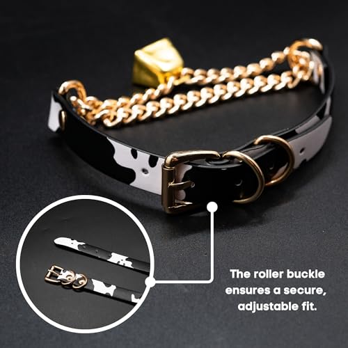 • COW-PRINT COLLAR FOR WOMEN:Make a bold, playful statement with this cow-print choker collar, crafted from high-quality vegan leather. Designed with a shiny gold bell, durable,lightweight and water proof aluminum slip chain and a dual D-ring secure buckle, this piece blends cute vibes with everyday edge.