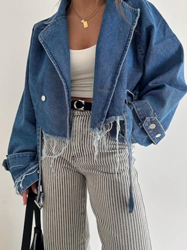 • 【STYLISH DESIGN】The 2025 trendy denim short jackets for women features a belt, long sleeves, button closure, slimming fit, crop length, solid color, frayed hemline make this womens jean jacket flattering and stylish. This elegant crop jean jacket trenchcoat is perfect for the woman who wants to keep warm and charming all the time.