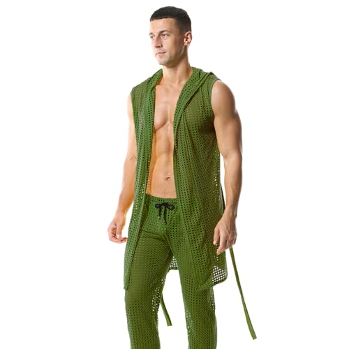 HOT ! Men's Mesh Fishnet Robes Hooded Short Sleeveless Bathrobes Nightwear
