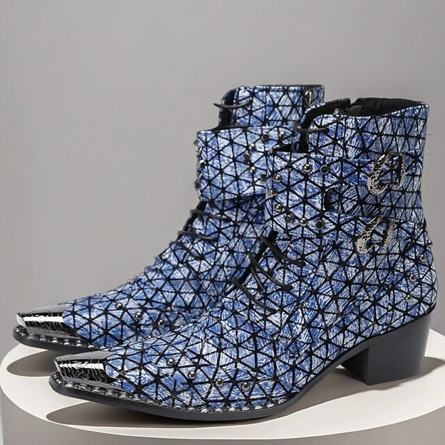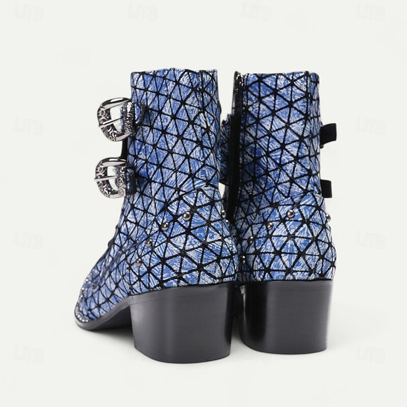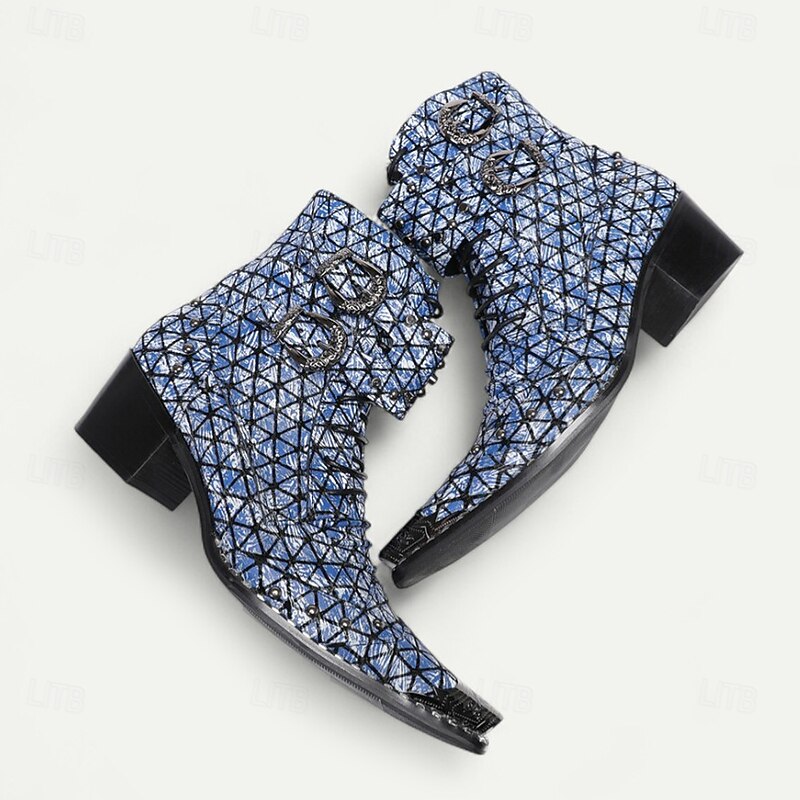 HOT ! Men's Blue Geometric Print Ankle Boots – Fashion Statement Cowboy Boots for Concerts, Streetwear and Nightlife Parties
