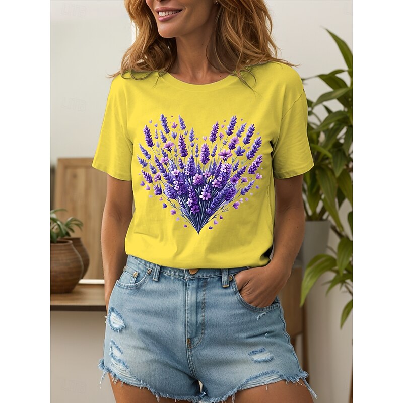 More information about Women's T Shirt Heart Floral Graphic Vintage Stylish Classic Short Sleeve Crew Neck Round Neck Regular Tops Daily Going out Weekend Print Black White Yellow Pink Blue Summer Spring Fall