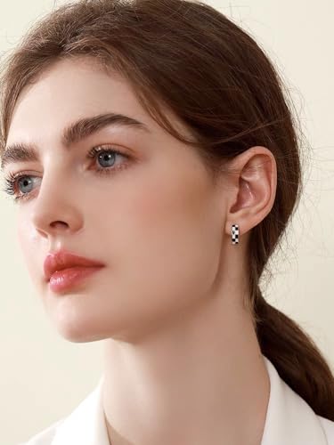 More information about Cute Checker Small Hoop Earrings for Women Cartilage Dainty Sterling Silver Plated Black White Enamel Round Circle Huggie Hoops Hypoallergenic Hooped Fashion Trendy Jewelry Gifts 10mm
