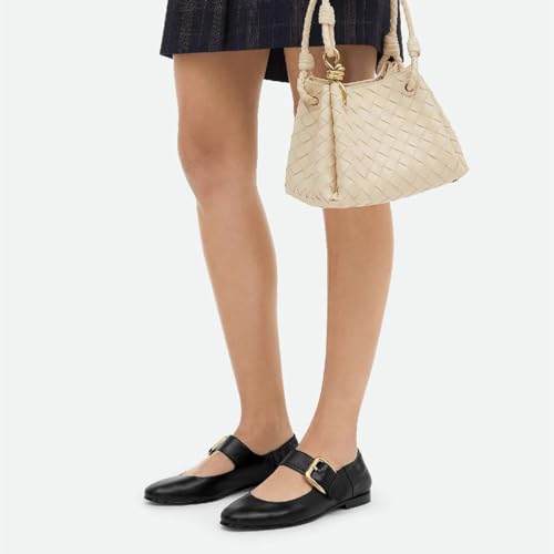 • [Shoes Features] Women's round toe leather mary-jane ballerina with Intrecciato detail on the backstay featuring a glossy metal gold-tone buckle.