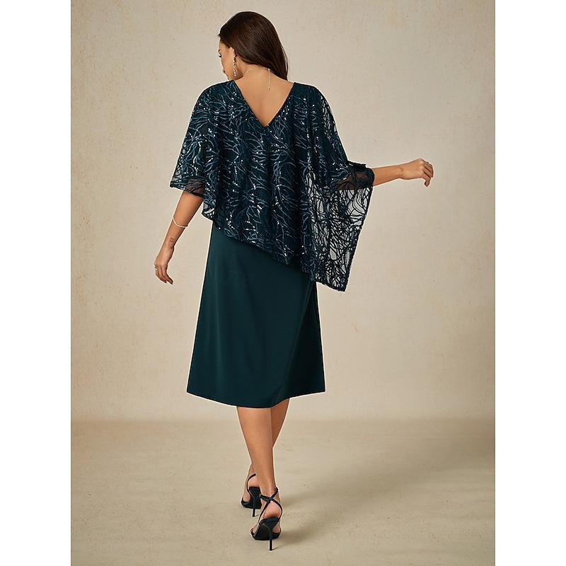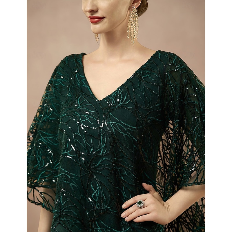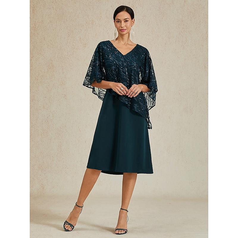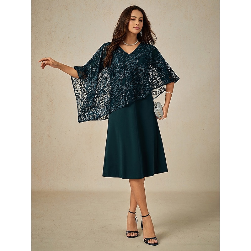 More information about Women's Tea Length Formal Dress A Line Dress Cape Dress Elegant Wedding Wedding Guest Cocktail Party Regular Fit Plain Half Sleeve V Neck Dark Green Summer Spring Fall