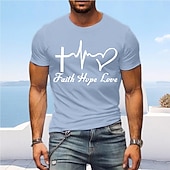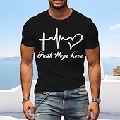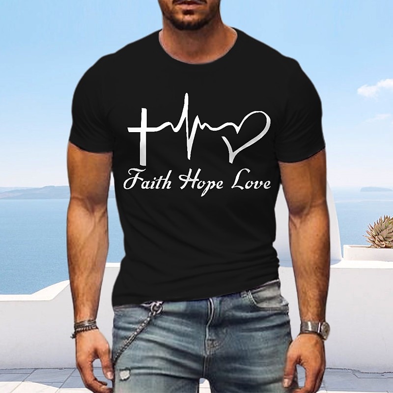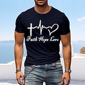 : Featuring bold, graphic prints on a versatile base color, this T-shirt stands out with its striking letter graphics and meaningful symbols like a cross, heartbeat line, and heart, encapsulating the essence of "Faith Hope Love." The design is completed with short sleeves, making it perfect for warm weather.
