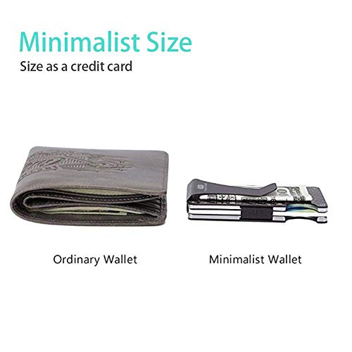 • 【Money Clip & Elastic Webbing】The classical money clip is made of spring steel, it can be used to hold cash and bills handy. Flexible elastic webbing greatly improved the card holding capacity, your card will not slip out easily. The card portion has a convenient cut out where with a simple thumb maneuver your cards are exposed for you to choose the one needed. Black aluminum slim cash credit card holder for front back pants pocket carry.
