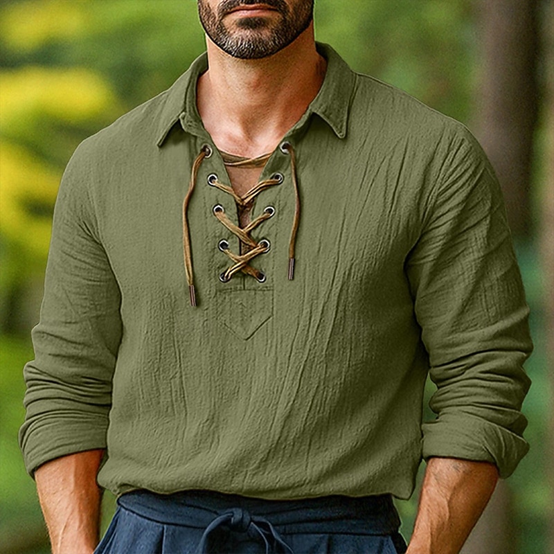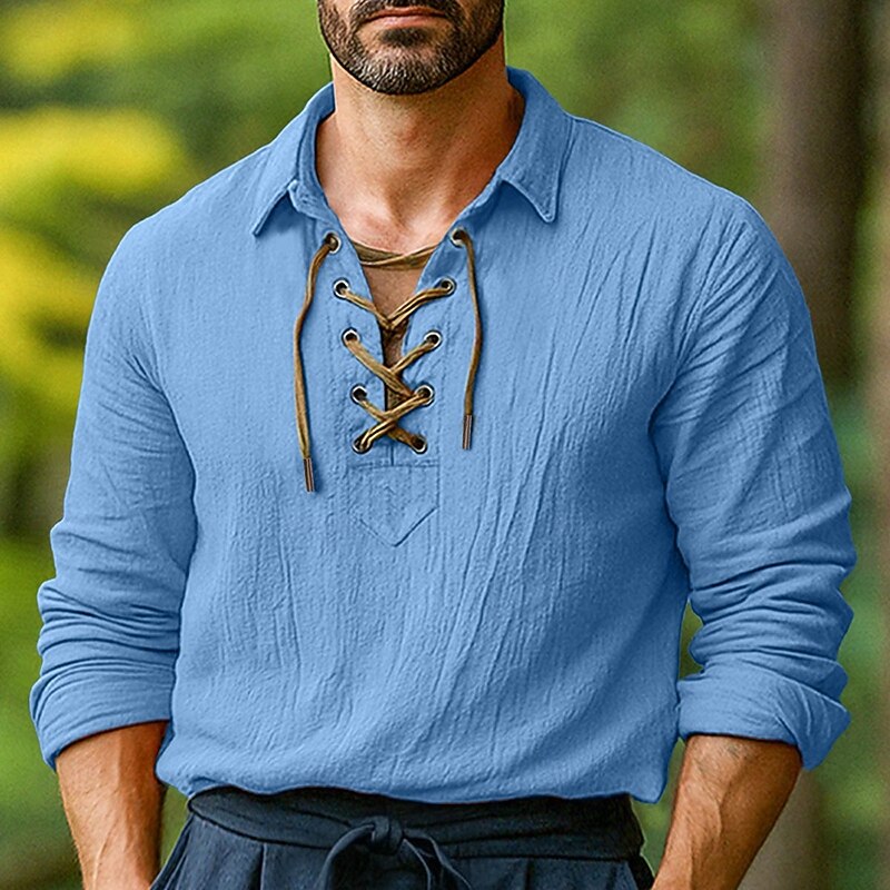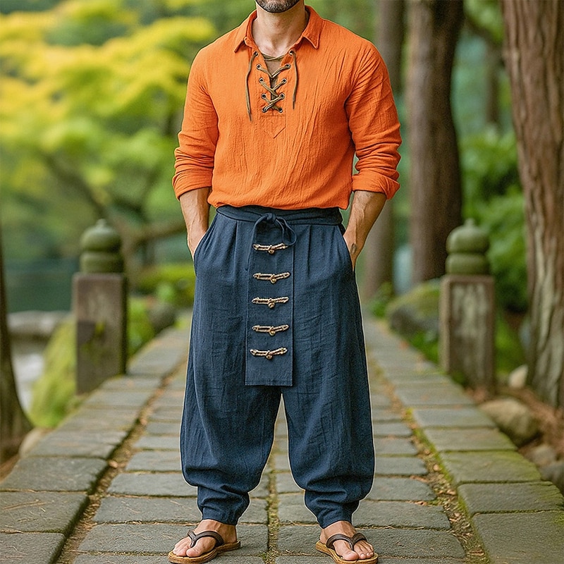 More information about Men's Shirt Linen Shirt Viking Style Summer Shirt Beach Wear Solid Color Vacation Street White Orange Green Light Blue Long Sleeve Collarless Clothing Apparel
