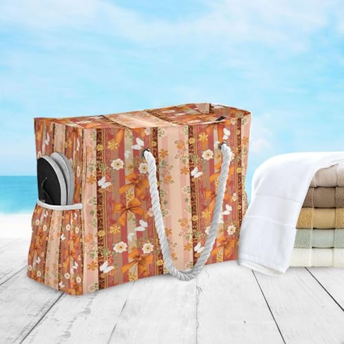HOT ! Flower Ribbon Beach Tote Bag for Women Large Pool Bags Carry On Bag With Wet Compartment for Beach Travel with Pocket Zipper Outdoor Tote Bag