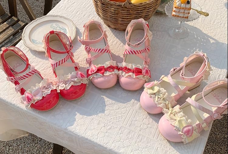 ZQW Sweet Lolita Mary Jane Shoes Kawaii Strawberry Cake Pumps for Women Handmade Chunky Mid Heel Girls Cosplay Party Shoes 6