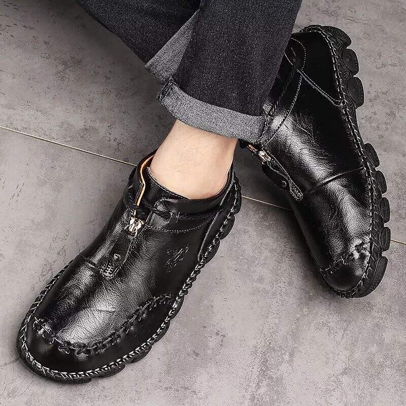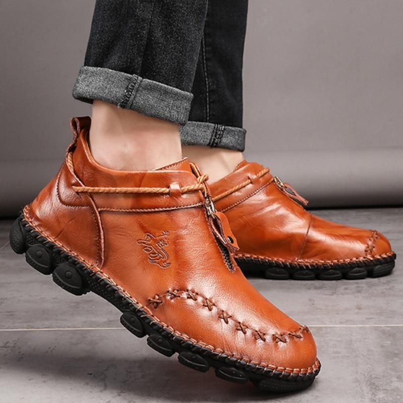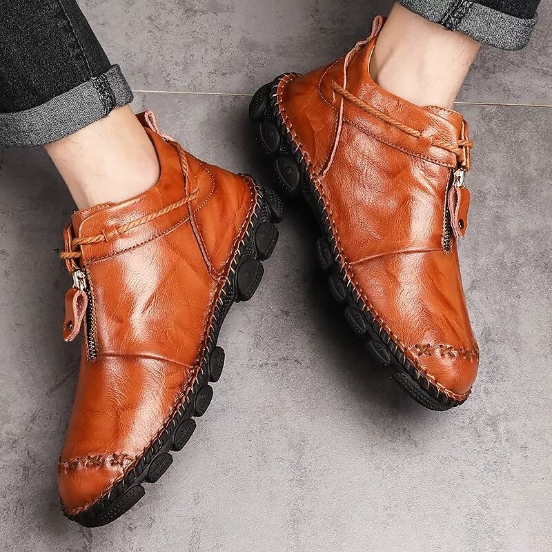 Highlights [Fabric and Material] : Crafted from high-quality genuine leather, these men's boots offer a rich brown hue with elegant textural detailing, emphasizing durability and timeless style. The interior lining is soft, enhancing comfort and breathability for extended wear. [Style and Fit] : Featuring a comfortable slip-on style with a convenient side zipper for easy wear and removal, these boots are designed for effortless everyday use. The round toe shape and cushioned sole offer excellent traction and shock absorption, making them suitable for all-day comfort. [Design Highlights] : The distinctive retro design is complemented by unique hand-stitched accents along the seams, enhancing both aesthetics and classic appeal. The boots exhibit a sophisticated look with a focus on craftsmanship and contemporary style. [Occasions] : Perfect for daily outings, these boots are versatile enough for various settings. Whether you're walking outdoors or going about your day-to-day activities, these boots effortlessly combine fashion and functionality for any occasion. [Size Availability] : Available in a range of sizes from US6-6.5 (EU38) to US12 (EU45), catering to men who value both comfort and style in their footwear choices.