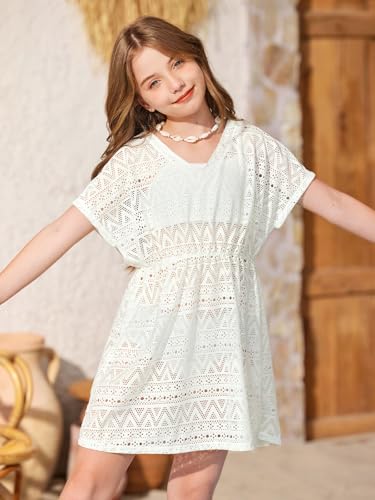 BesserBay Girls Summer Crochet Bat Sleeve Hollow Out Sheer Swimsuit A-line Hem Loose Fit Quickly Dry Coverups 5-14 Years 5