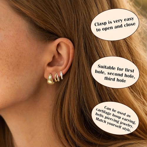 • Gold Earrings for Women Trendy--This gold earrings set provides 3 different styles and designs,including classic cz hoop earrings, small huggie hoop earrings and chunky earrings to choose from. You can easily find your perfect match, catering to various wearing preferences.