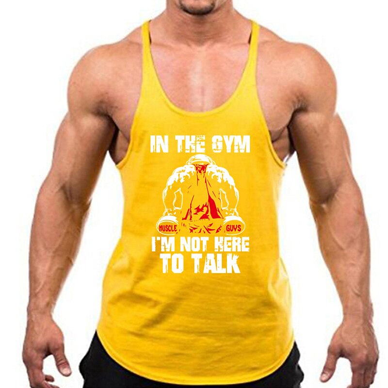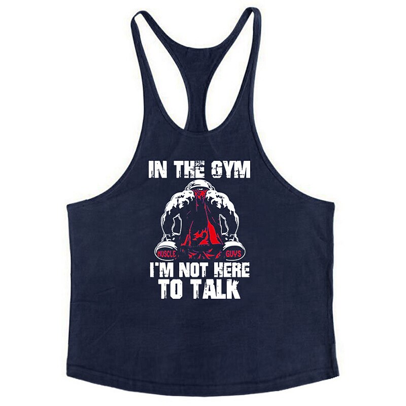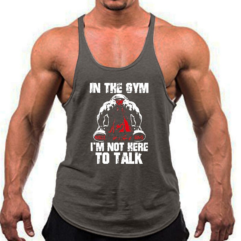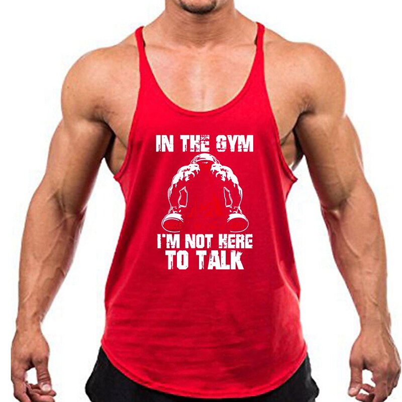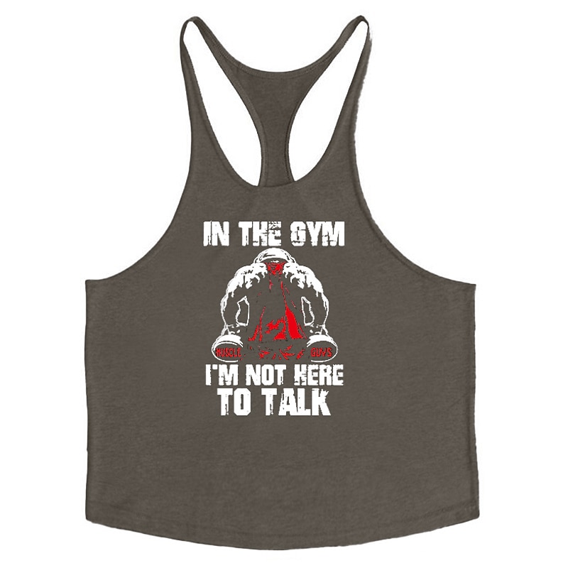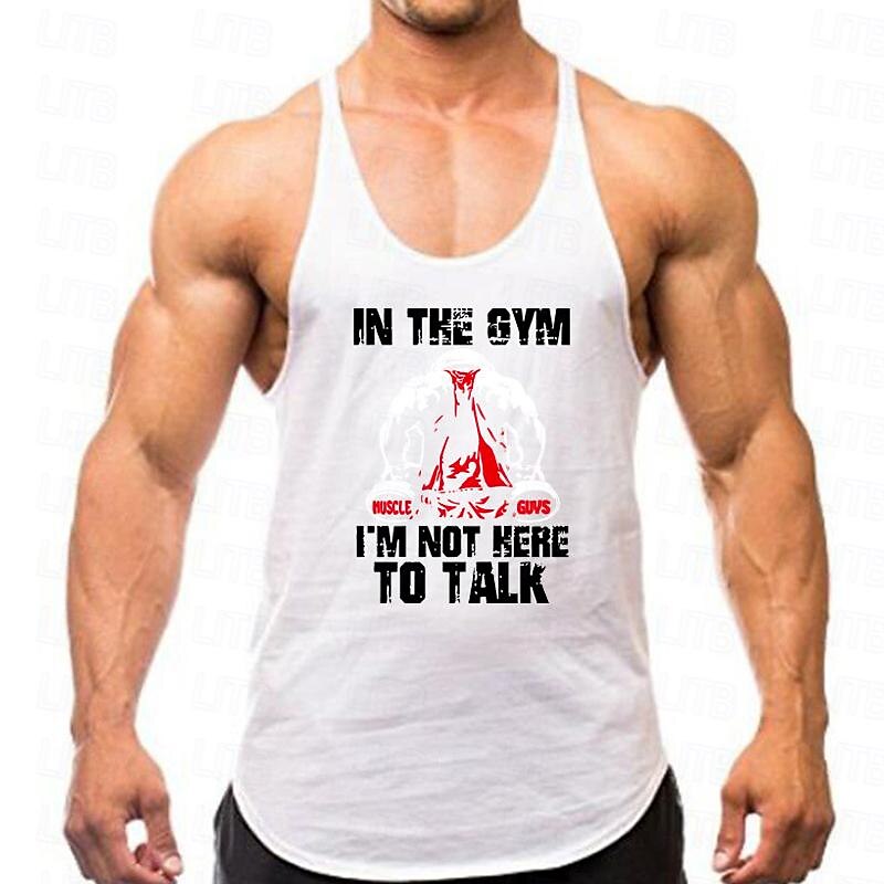 Highlights [Fabric] : Crafted from a high-quality blend of cotton and polyester, this tank top offers a soft, breathable and moisture-wicking experience, perfect for keeping cool and comfortable during workouts or on hot summer days. [Fit] : Designed with a relaxed fit, this racerback tank top allows for optimal mobility and layering. Its sleeveless design provides complete freedom of movement, making it suitable for various types of exercises from weightlifting to cardio. [Design Highlights] : The tank top features a bold graphic print with the motivating phrase "IN THE GYM, I'M NOT HERE TO TALK," accompanied by a strong muscular illustration. The U-neck design adds a classic touch, while the racerback style offers athletic appeal. The color palette of black, white, and red creates a striking look that stands out in any gym setting. [Occasions] : Ideal for gym sessions, sports activities, daily wear, and casual vacations, this tank top is versatile and suitable for both fitness enthusiasts and those who enjoy a fashionable yet comfortable look. [Sizes] : Available in a range of sizes from M to XXL, catering to different body types and ensuring a comfortable fit for a wide audience. Whether for everyday wear or active pursuits, this tank top delivers both style and functionality.