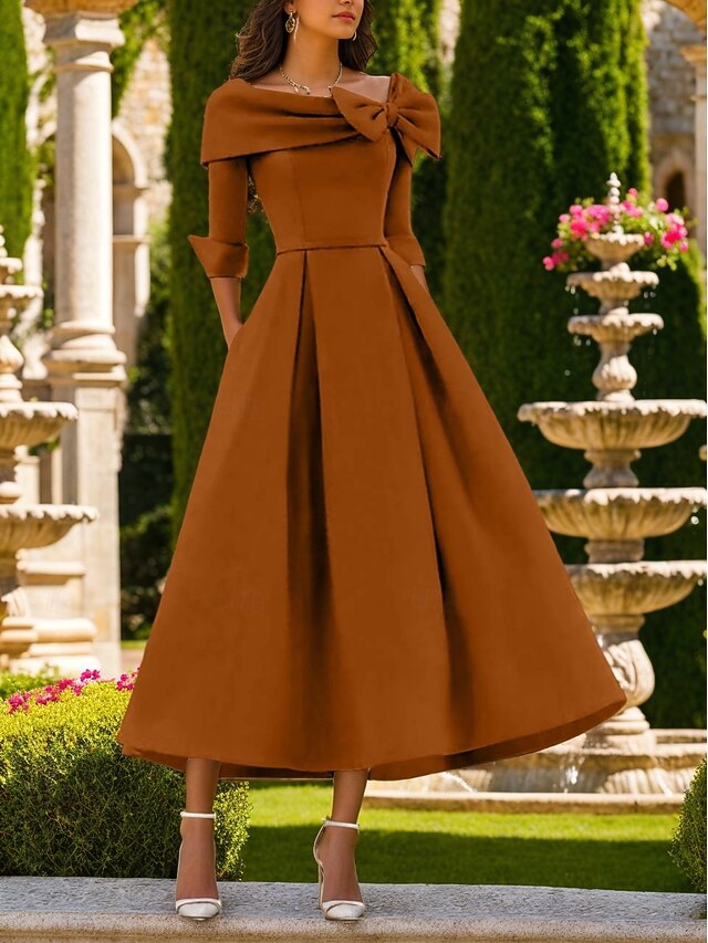 HOT ! A-Line Cocktail Dresses Elegant Dress Formal Wedding Guest Tea Length 3/4 Length Sleeve Square Neck Pocket Satin with Bow(s) Pocket