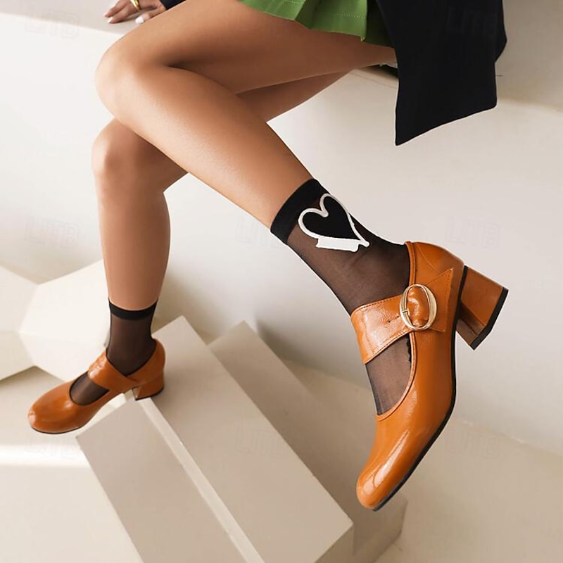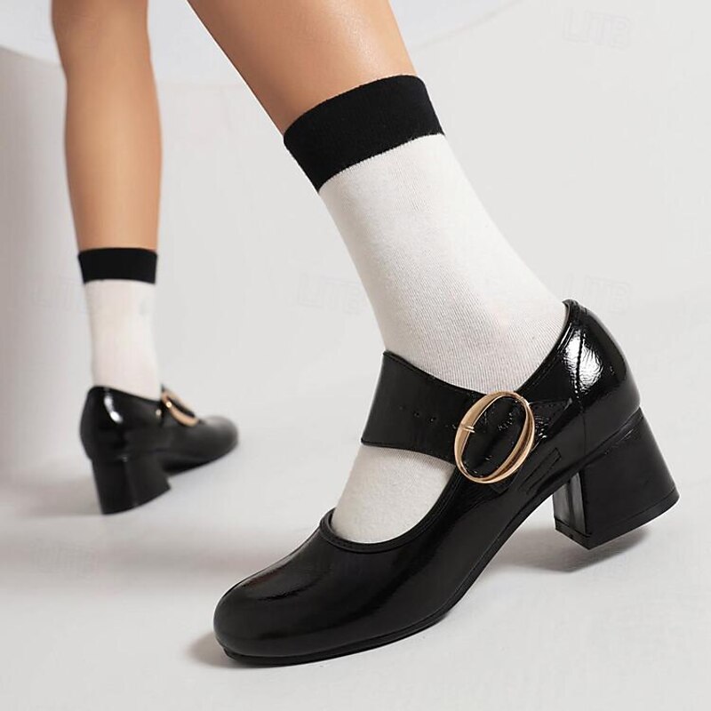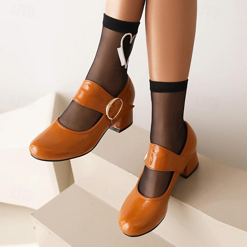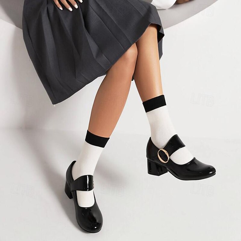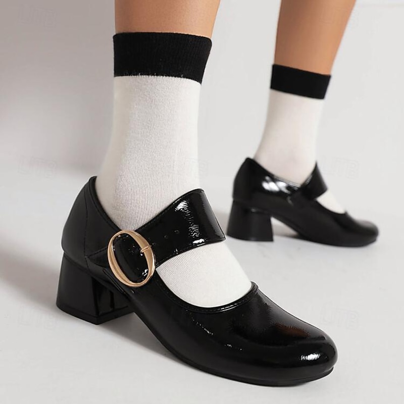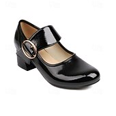 Highlights - Stylish patent leather upper - Comfortable synthetic leather lining - Stable and trendy chunky heel - Classic round toe shape - Durable rubber outsole