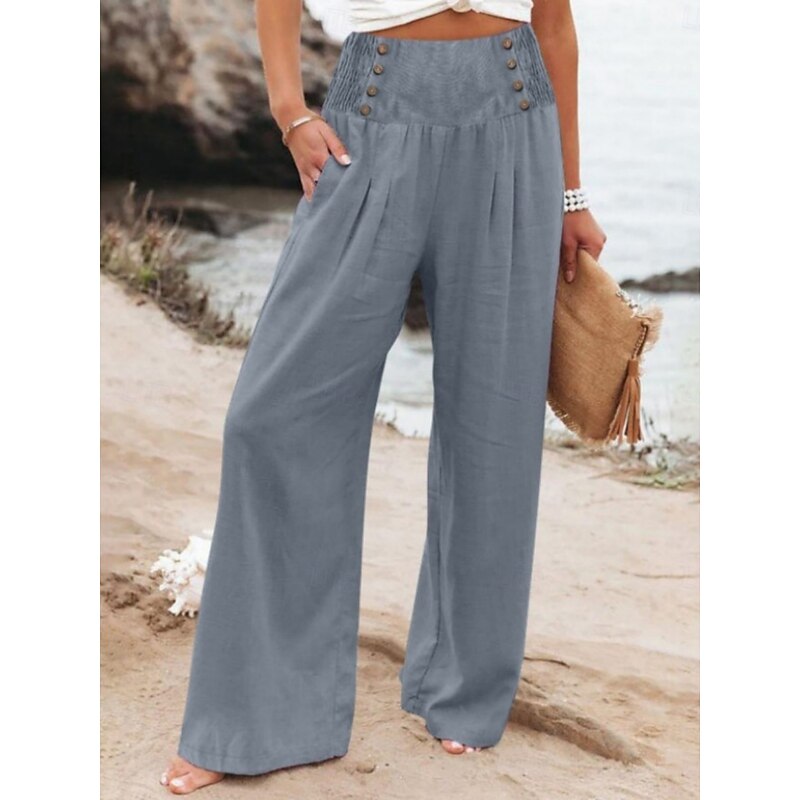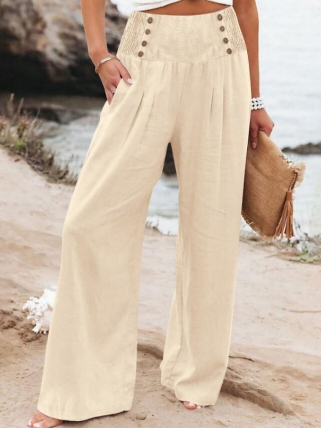 Women's Cotton Linen Wide Leg Solid Color Chinos Baggy Pants Basic Casual Full Length High Waist Plain Elastic Waistband Comfy Soft Comfortable Micro-elastic Outdoor Street Beach 1
