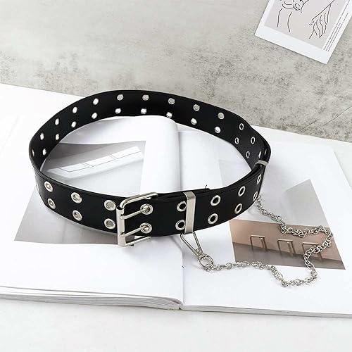 Leadigol Double Grommet Leather Belt with Chain, Punk Black Belt Waist Belt Long Pin Buckle Belt for Women Men Jeans(black) 7
