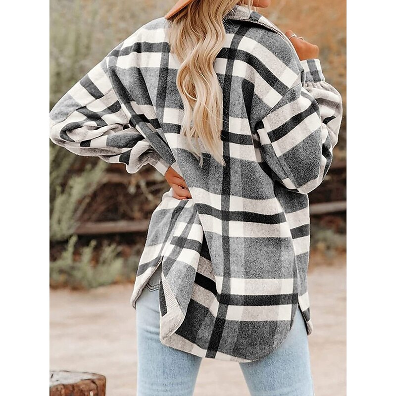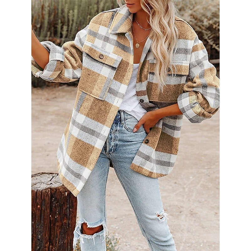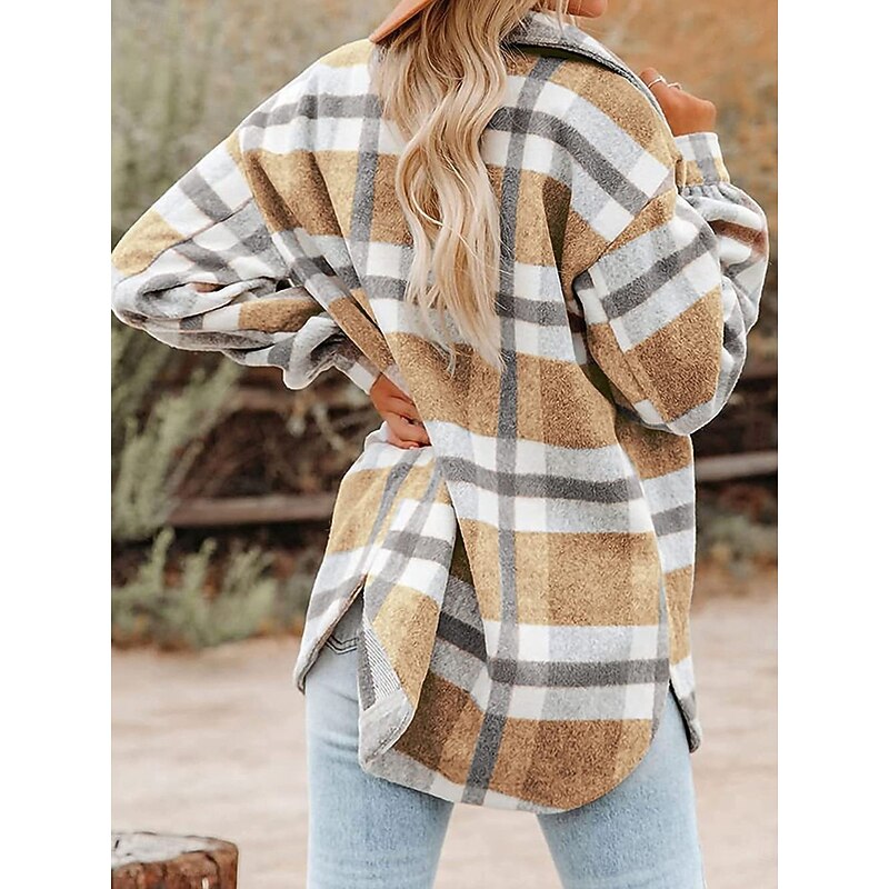 Women's Shirt Jacket Shacket Warm Breathable Buttons Pocket Print Casual Plaid Vacation Street Daily Wear Going out Single Breasted Regular Turndown Regular Fit Long Sleeve Outerwear Black Khaki