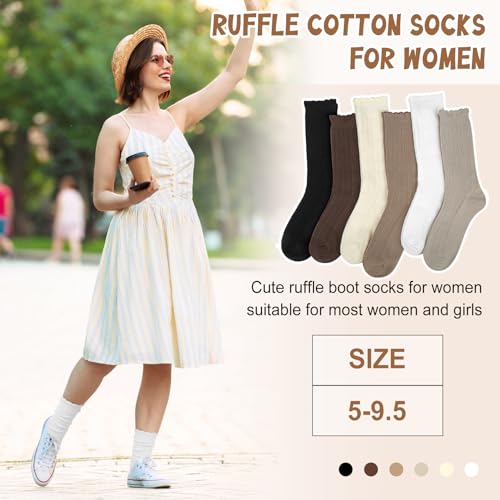 • Size and Packing: One set contains 6 pairs of ruffle cotton socks for women, these stylish womens crew socks are suitable for wearing all year round; Cute ruffle boot socks for women are designed to be uniform size, able to adapt to American sizes 5-9.5, suitable for most women and girls