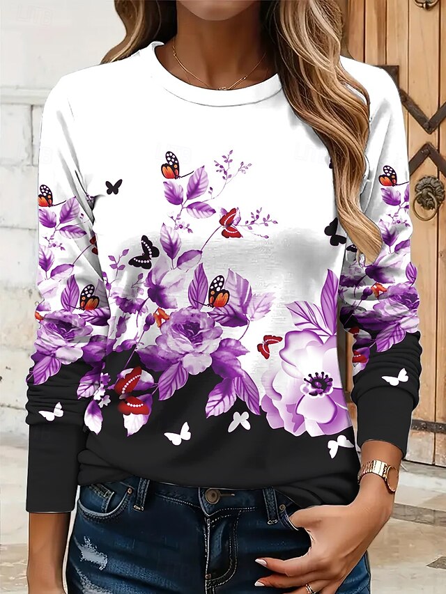 Women's T shirt Crew Neck Long Sleeve Tunic Floral Graphic Butterfly Vintage Stylish Classic  Round Neck Regular Tops Daily Print Yellow Red Blue Purple Green Fall 12