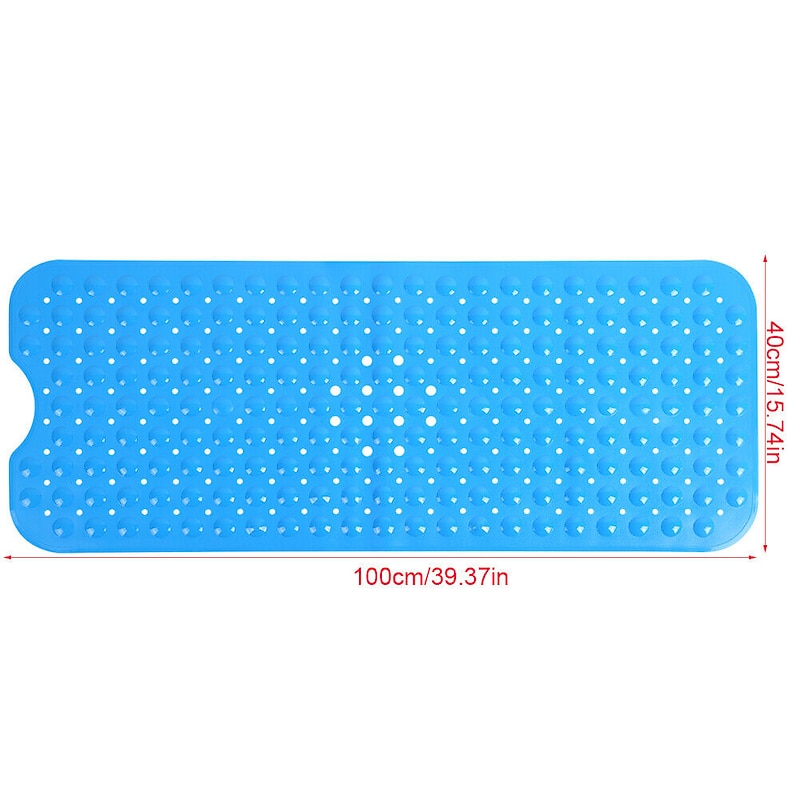 10. Product Specification: The mat is made of plastic and rubber, has a blue color, dimensions of (38.97 x 15.35)" / (99 x 39)cm (W x W), weighs 850g, and is suitable for use in the bath and bathroom floor.