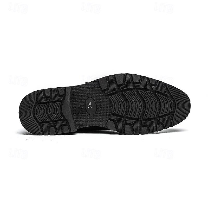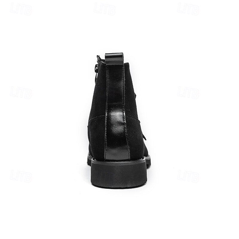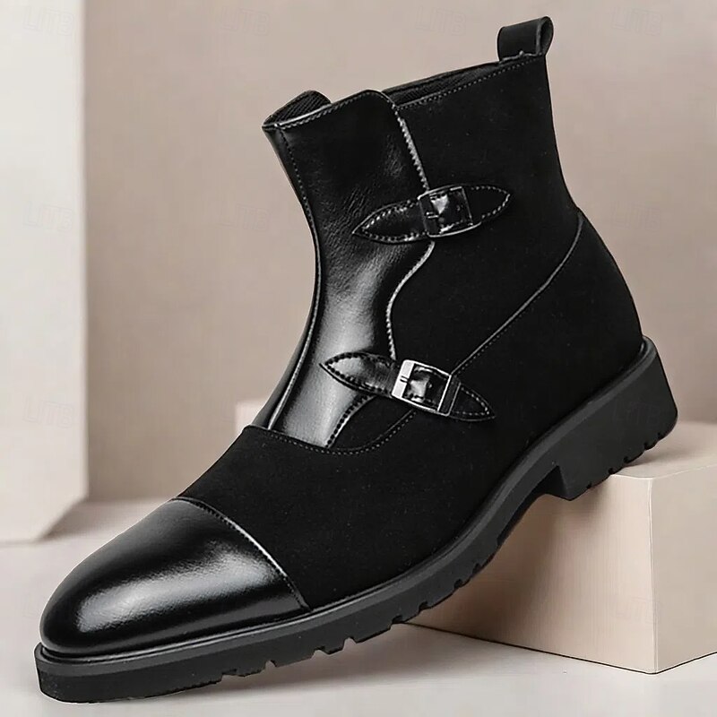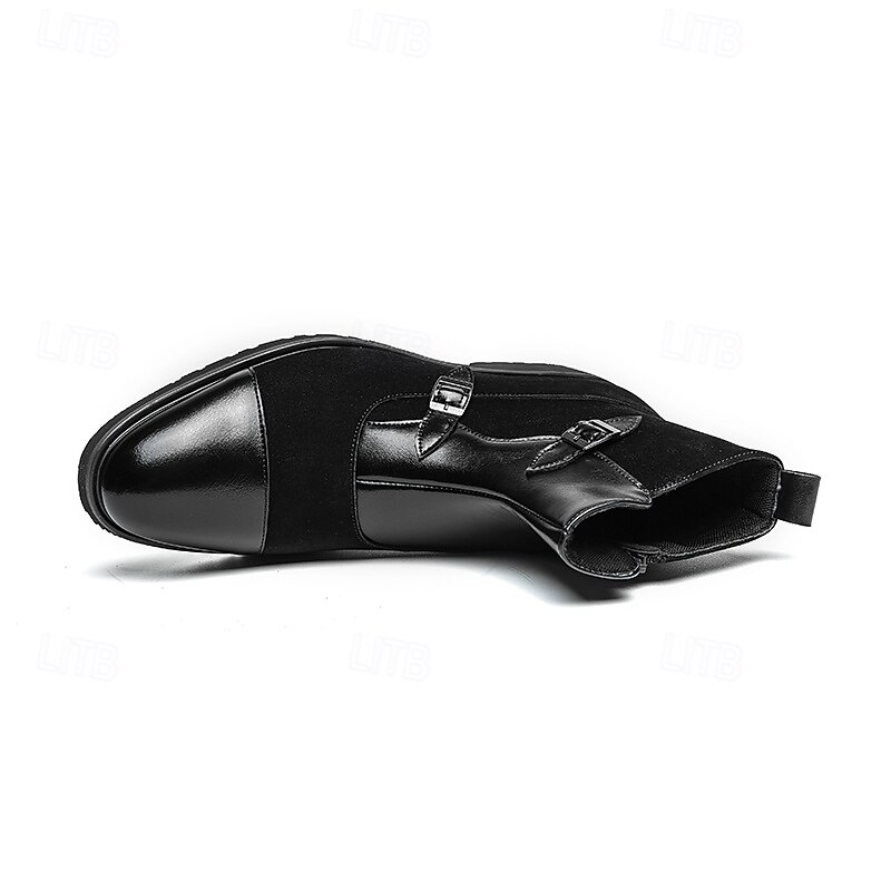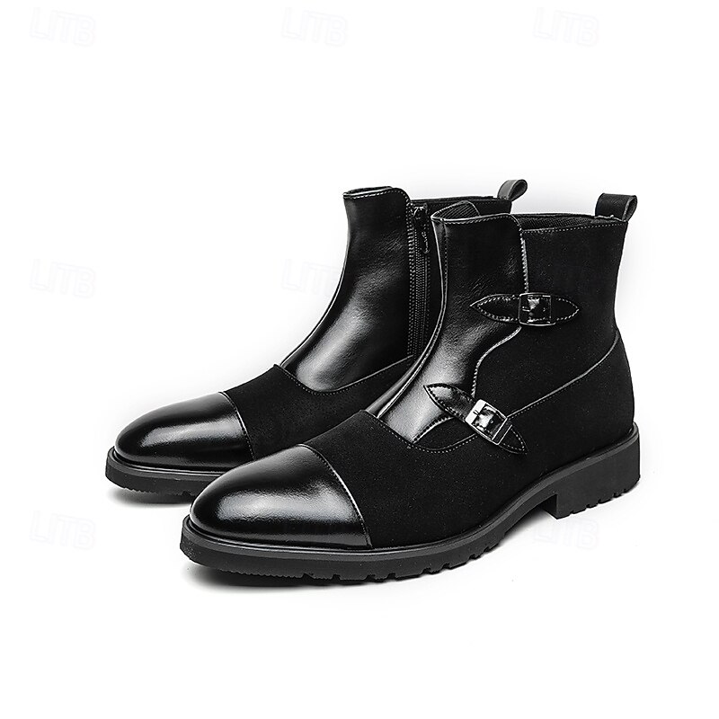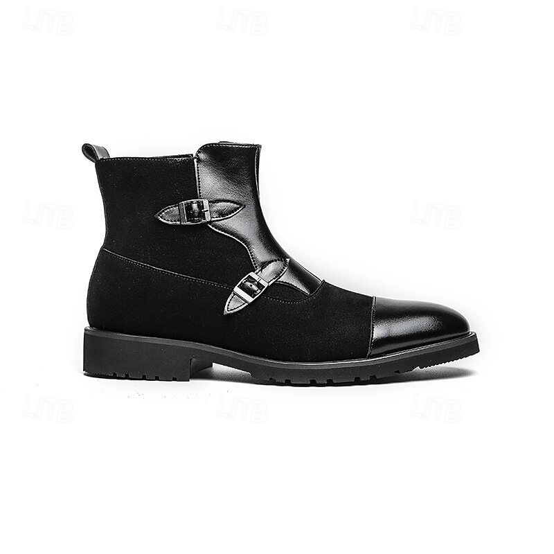 Highlights [Fabric] : Expertly crafted from high-quality PU leather, these men's ankle boots feature a combination of smooth PU leather and soft suede-like material. This blend offers a luxurious, supple texture, providing both comfort and durability. [Fit] : The round toe shape and ankle-length design ensure a comfortable and fashionable fit. The boot features a loafer-style closure that complements its sleek appearance while allowing for easy wear. [Design Highlights] : These elegant boots are designed with double buckle straps that are both functional and stylish. The polished leather toe cap and side detailing add sophistication and contrast, while the sturdy rubber outsole provides excellent grip and support for everyday wear. [Occasions] : Perfect for both formal and informal events, these boots elevate any outfit with a trendy twist. Ideal for parties, gatherings, and special occasions, they seamlessly transition from casual to dressy ensembles. [Size Range] : Available in a variety of sizes to ensure the perfect fit—ranging from US6-6.5 (EU38, UK5-5.5) to US11 (EU44, UK10) — these boots cater to a wide range of customer needs.