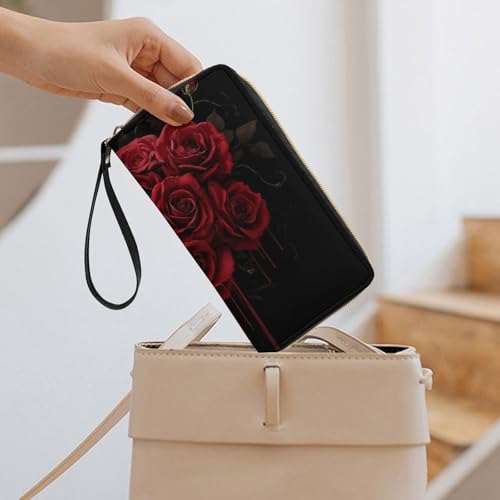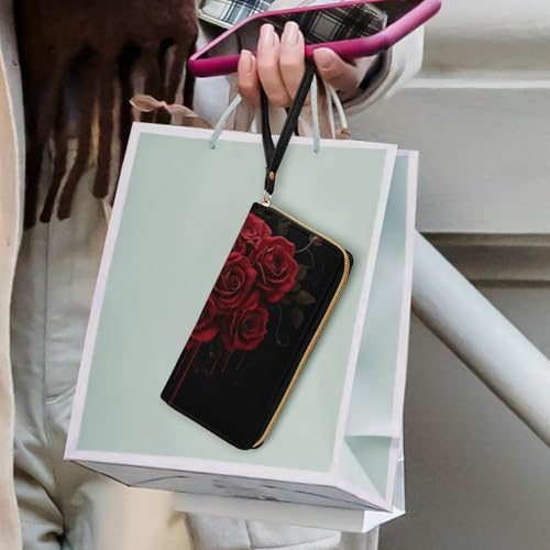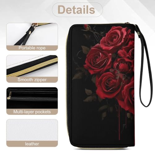 Large Capacity Slim Wallet for Women Waterproof Travel Long Purse Blood Red Rose Black Credit Card Holder with Multiple Card Slots 7