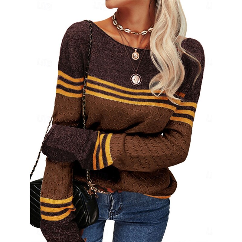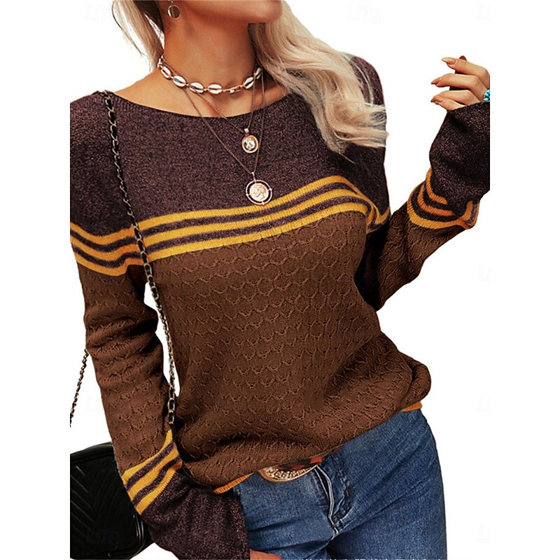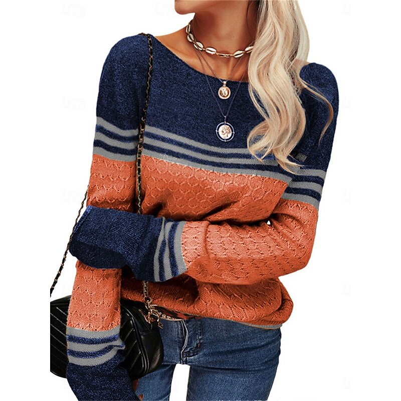 HOT ! Women's Sweater Pullover Sweater Jumper Casual Soft Striped Ribbed Crew Neck Patchwork Knitted Long Sleeve Regular Tops Knit Outdoor Daily Weekend Pink Orange Fall Winter
