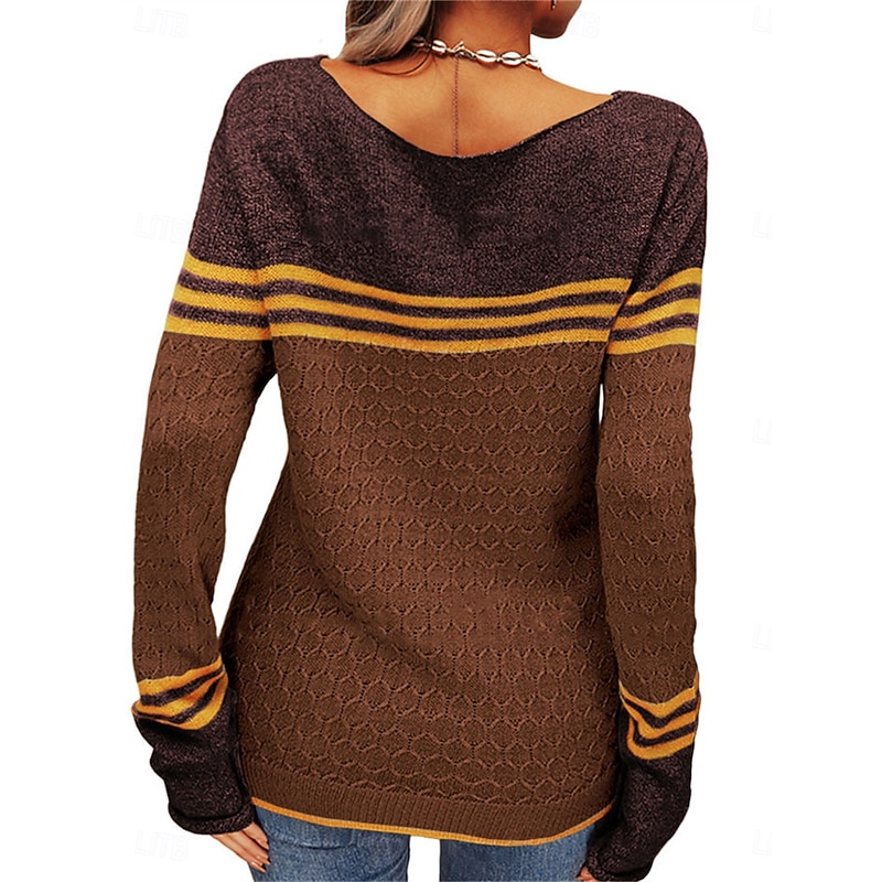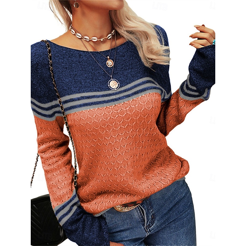 More information about Women's Sweater Pullover Sweater Jumper Casual Soft Striped Ribbed Crew Neck Patchwork Knitted Long Sleeve Regular Tops Knit Outdoor Daily Weekend Pink Orange Fall Winter