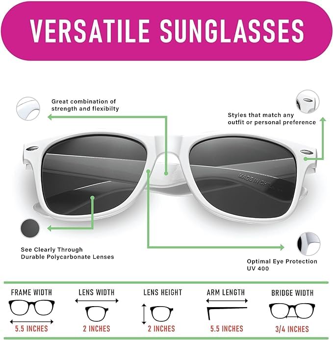 • BULK VALUE – ONE SIZE FITS MOST: Each order includes 12 white and 12 black retro-style sunglasses (24 total), perfect for party favors, weddings, graduations, bachelorette parties, beach days, and more. Each pair measures 5.5 inches wide and comfortably fits both adults and kids — one size fits most!