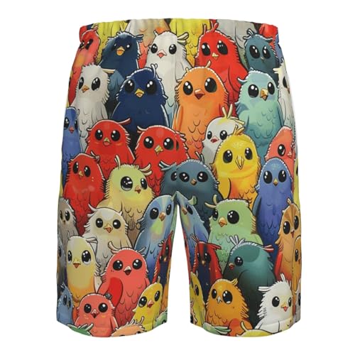 HOT ! Men's Quick Dry Swim Shorts Cute Birds Cartoon Drawing Colorful Beach Trunks with Pockets