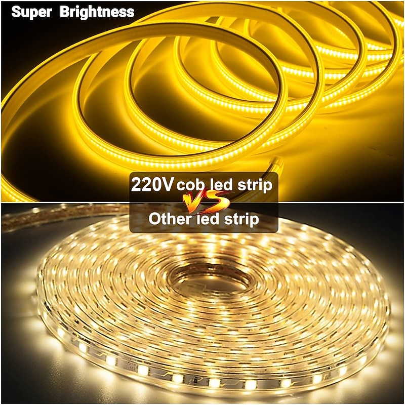 2M-30M COB LED Strip Light Plug in Flexible 220V Waterproof IP67 High Voltage Led Strip Multiple Colors 240LEDs/M Waterproof Led Light Strips for Bedroom Living Room Kitchen Furniture 9