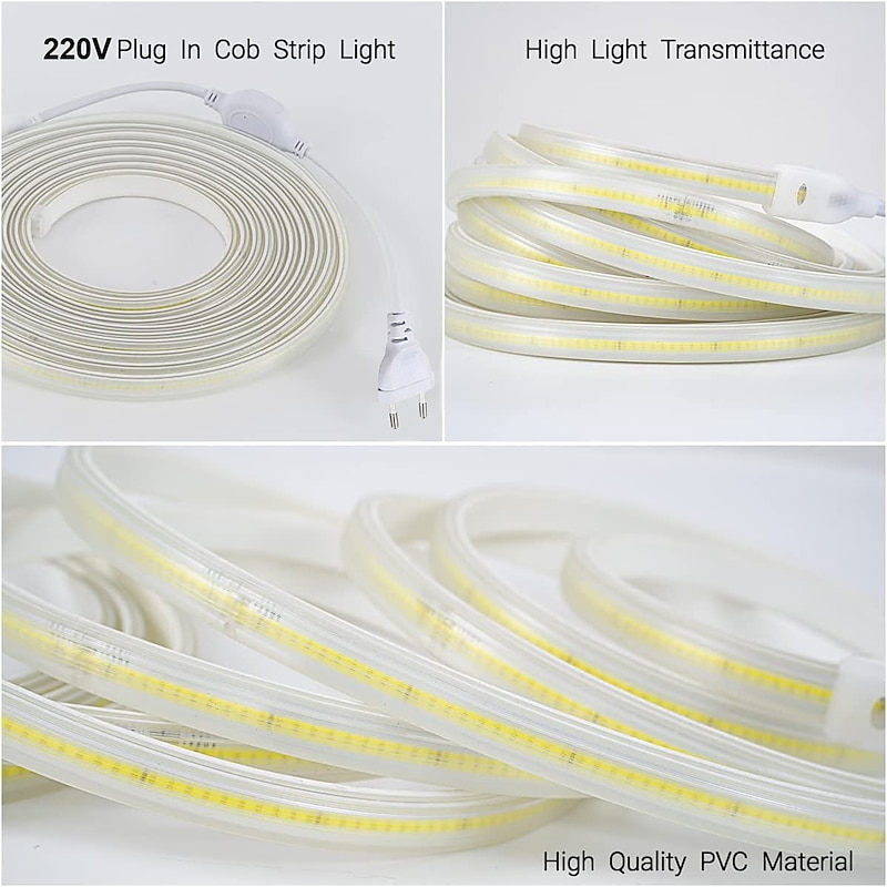 2M-30M COB LED Strip Light Plug in Flexible 220V Waterproof IP67 High Voltage Led Strip Multiple Colors 240LEDs/M Waterproof Led Light Strips for Bedroom Living Room Kitchen Furniture 11